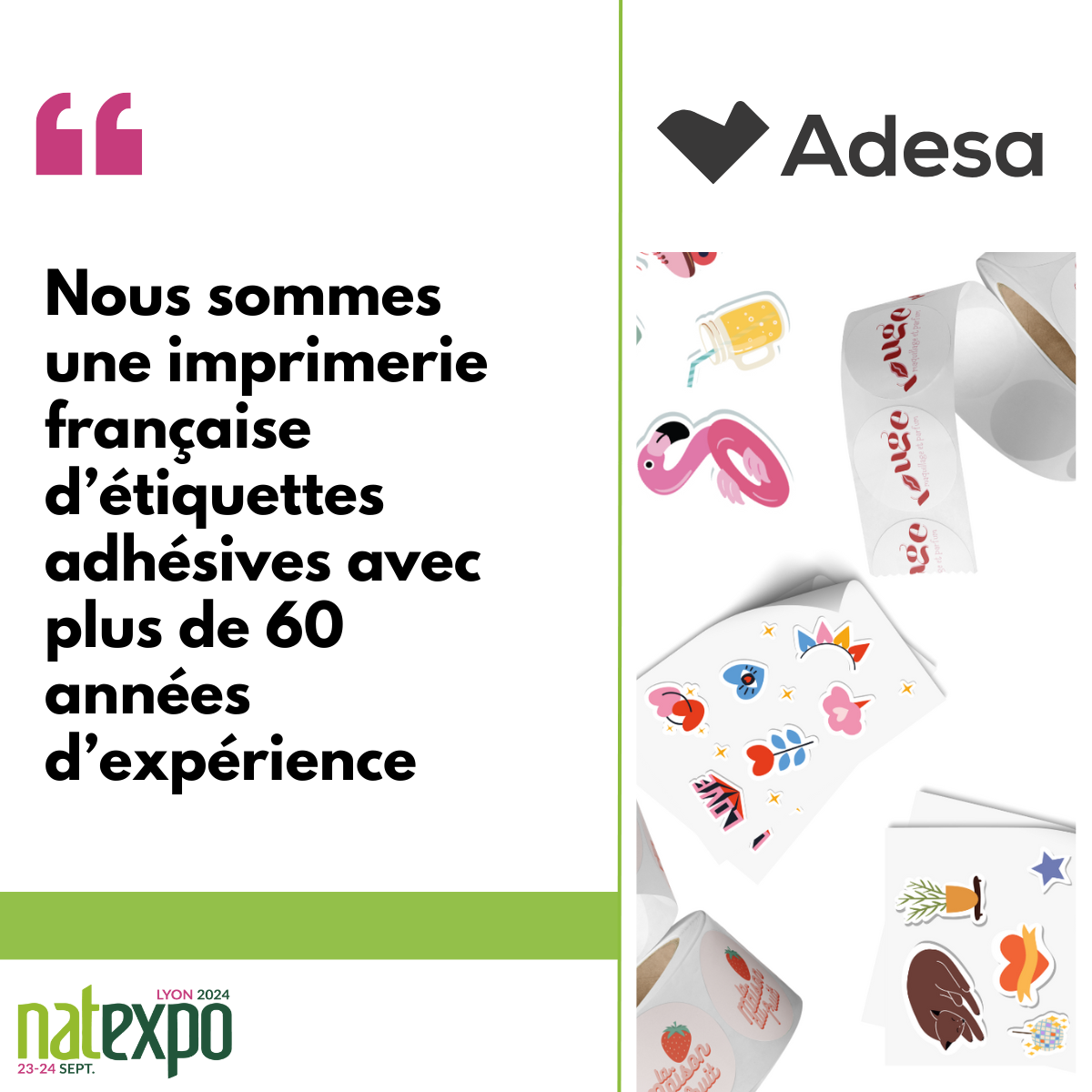 Adesa participera pour la première fois cette année à Natexpo. On vous les présente. 𝐏𝐫é𝐬𝐞𝐧𝐭𝐞𝐳 𝐯𝐨𝐭𝐫𝐞 𝐬𝐨𝐜𝐢𝐞́𝐭𝐞́ 𝐞𝐧 𝐪𝐮𝐞𝐥𝐪𝐮𝐞𝐬 𝐦𝐨𝐭𝐬 Nous sommes une imprimerie française d’étiquettes adhésives avec plus de 60 années d’expérience. Nous proposons une offre traditionnelle permettant de répondre aux besoins spécifiques des professionnels notamment par le biais d’appels d’offre, ainsi qu’une offre…