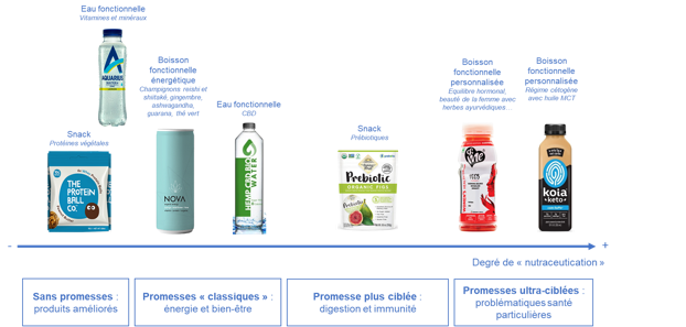 La nutraceutication va des aliments simplement améliorés dans l’idée de gagner en qualité nutritionnelle ou en praticité, jusqu’aux aliments valorisant une promesse santé ultra-ciblée. La différenciation se joue sur l’originalité des ingrédients, les techniques de production particulières et la précision des bienfaits santé qui en découlent.