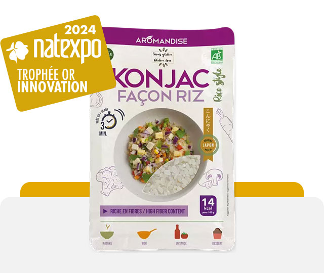 Konjac façon riz AROMANDISE Ce riz de Konjac est fabriqué de manière traditionnelle au Japon. Prêt en 3 minutes, il contrinue à la perte de poids et à la santé intestinale. Le tout sans odeur du Konjac.