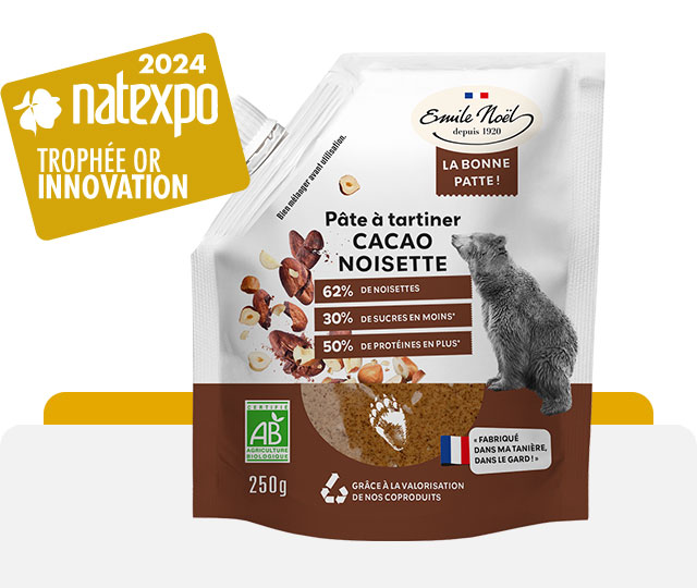 Pâte à tartiner Cacao Noisette GROUPE EMILE 62% de noisettes, 30% de sucres en moins, 50% de protéines en plus, c’est ce que vous apporte notre « Bonne Patte » Cacao Noisette grâce à la valorisation de notre farine de tourteau.