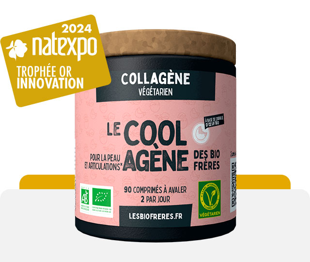 Coolagène LES BIO FRÈRES Notre produit provient de la membrane de la coquille d’oeuf, c’est une association de collagène, acide hyaluronique, élastine et glucosamine. Cette source est certifiée biologique.