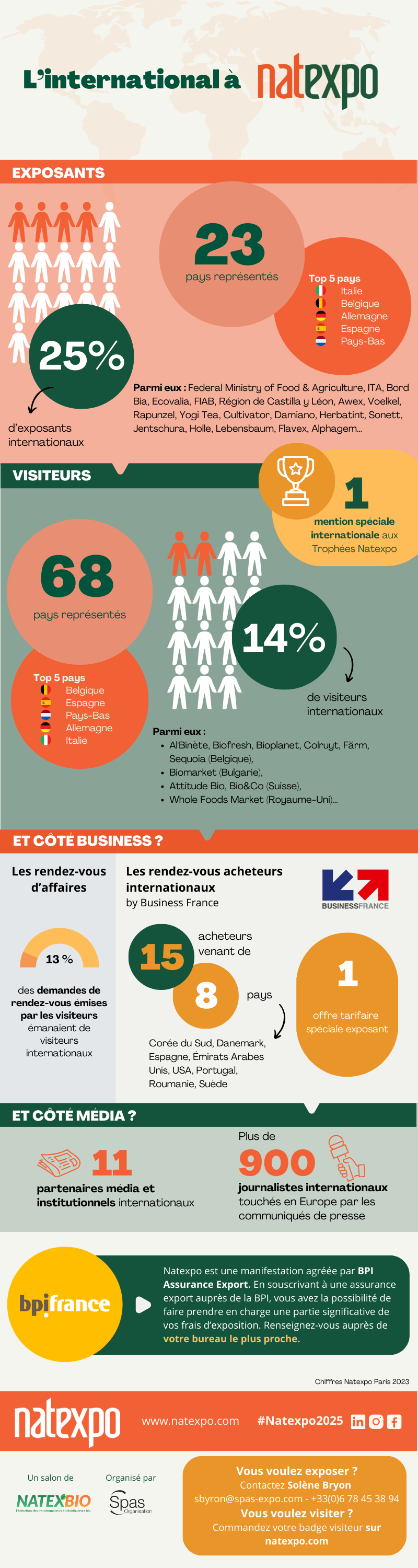Avec 25 % des exposants venant de l’étranger, Natexpo confirme son rôle d’accélérateur à l’export pour les professionnels de la bio. L’édition 2025 propose des initiatives clés pour soutenir la présence internationale :