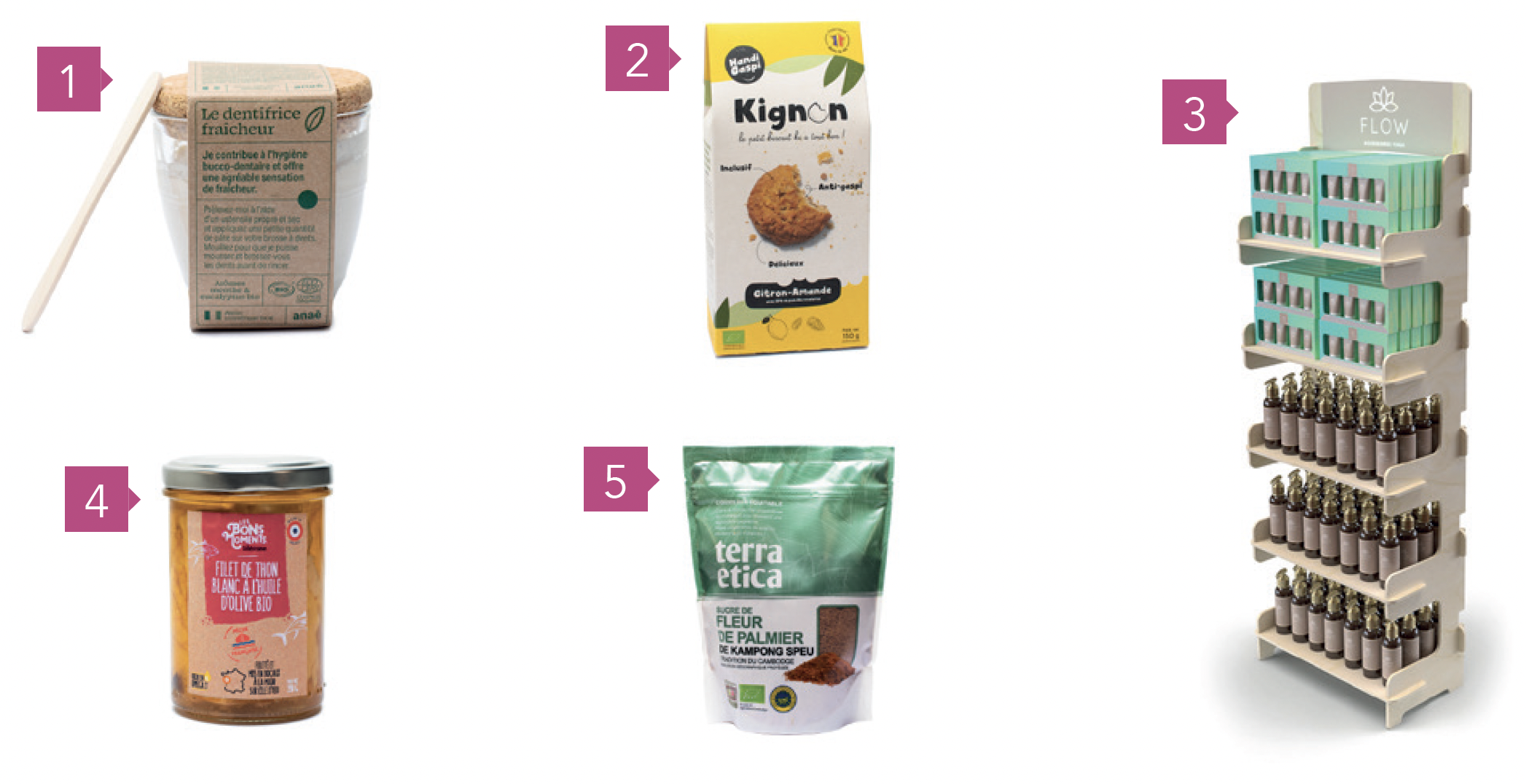 - Kignon Citron-Amande, biscuits fabriqués et conditionnés par des personnes handicapées (30 travailleurs handicapés formés), élaborés à partir d’invendus de pain bio (4000 baguettes sauvées, soit l’équivalent de 600000L d’eau économisés), avec approvisionnement local et emballage écologique, par La Biscuiterie Handi-Gaspi, stand J152.