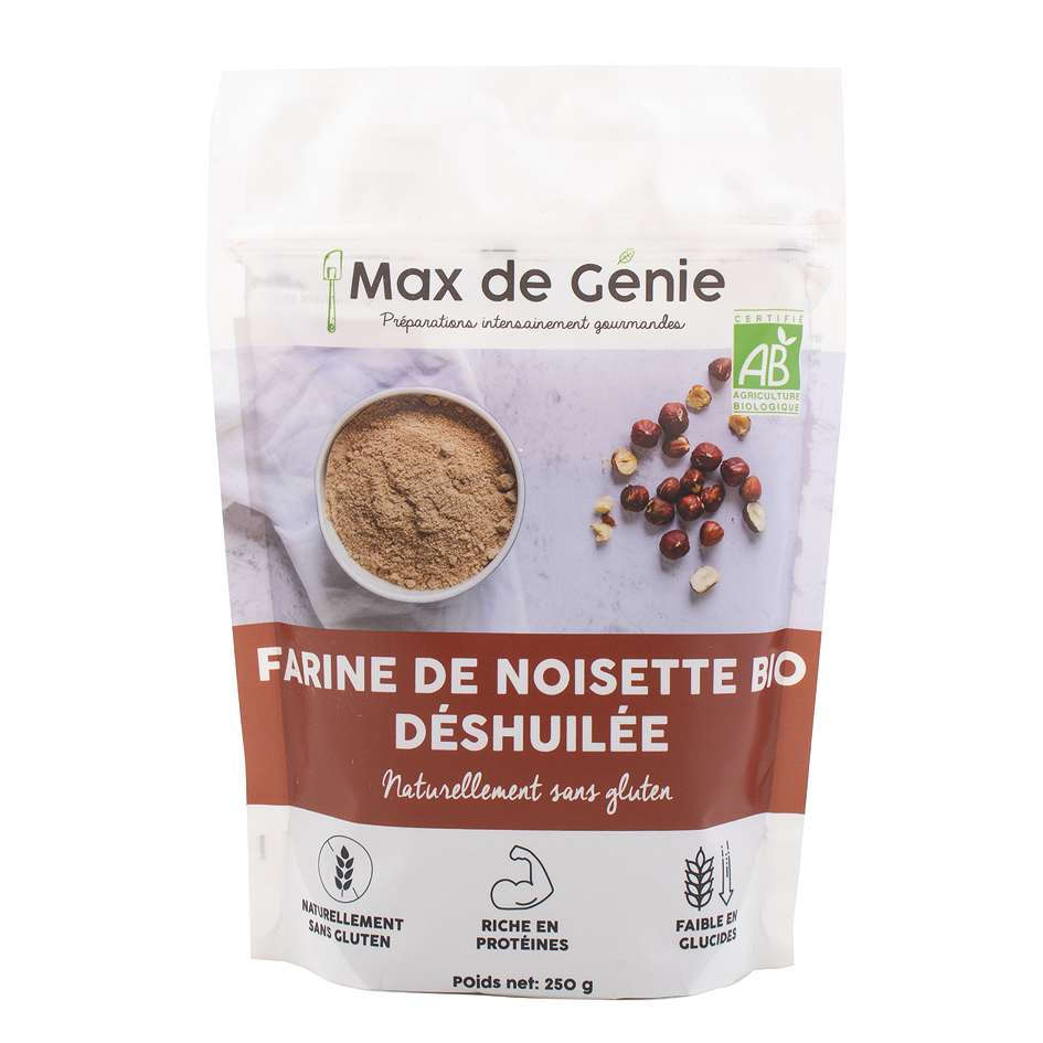 - Farine de noisettes déshuilée, à utiliser comme protéine végétale pour enrichir vos plats, issue de co-produits de l’industrie agroalimentaire, par Les Gourmands Exigeants / Max de Génie